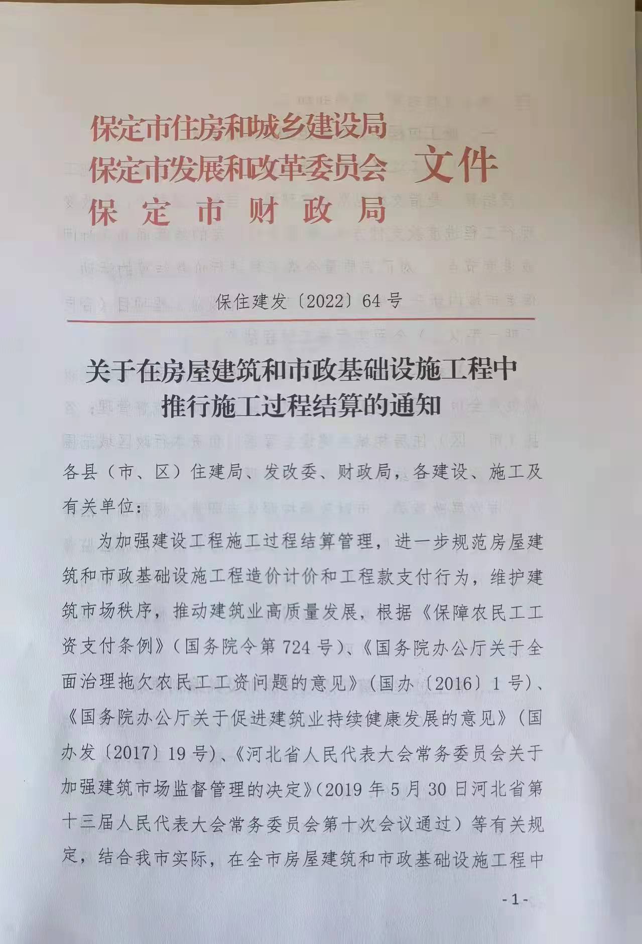 转发保住建发【2022】64号文《关于在房屋建筑和市政基础设施工程中推行施工过程结算的通知》